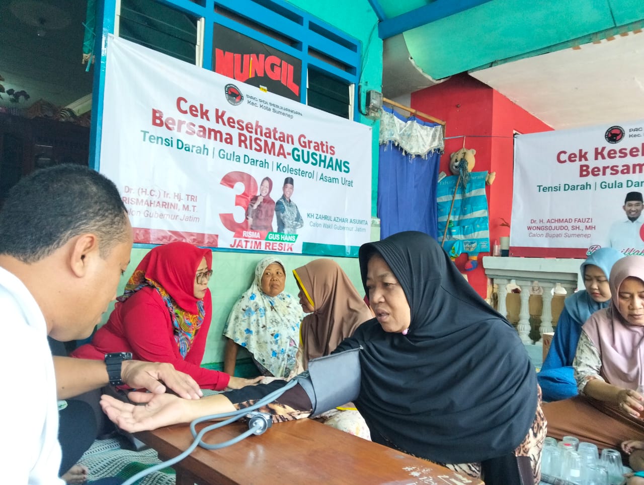 Salah satu kegiatan tes kesehatan gratis yang difasilitasi oleh PAC PDIP Kota Sumenep hari ini, terletak di rumah Yanto ranting Desa Pabian kecamatan Kota Sumenep. Puluhan warga berkumpul karena sangat antusias untuk mengikutinya.