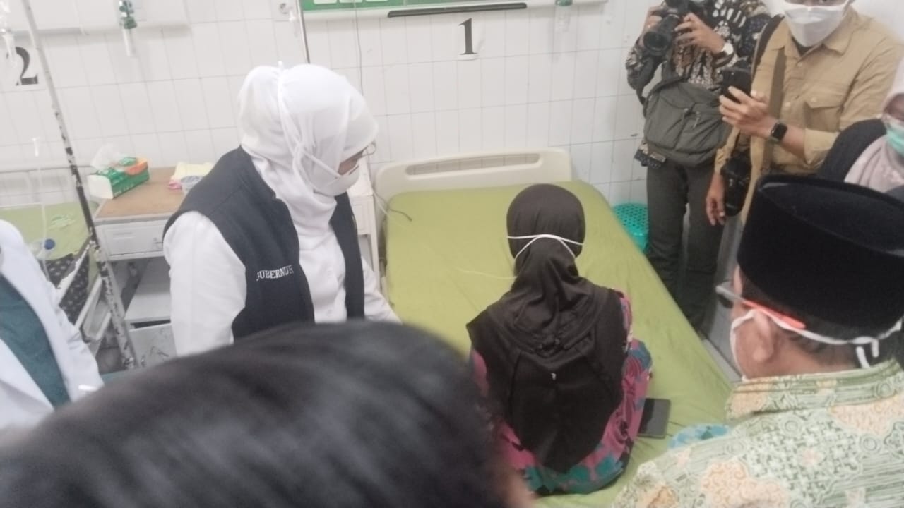 Kunjungan singkat berdurasi sekitar 15 menit itu dilakukan dengan penuh kehangatan. Kehadiran Khofifah yang didampingi Wakil Bupati KH. Imam Hasyim, Kepala Dinas Kesehatan P2KB dr. Elliya Fardasah, dr. Anita Febriana, Sp.A., M.Biomed, serta jajaran pejabat struktural RSUD, termasuk Kasi Informasi (Humas) Erfin Sukayati, M.Kes., disambut antusias keluarga pasien.