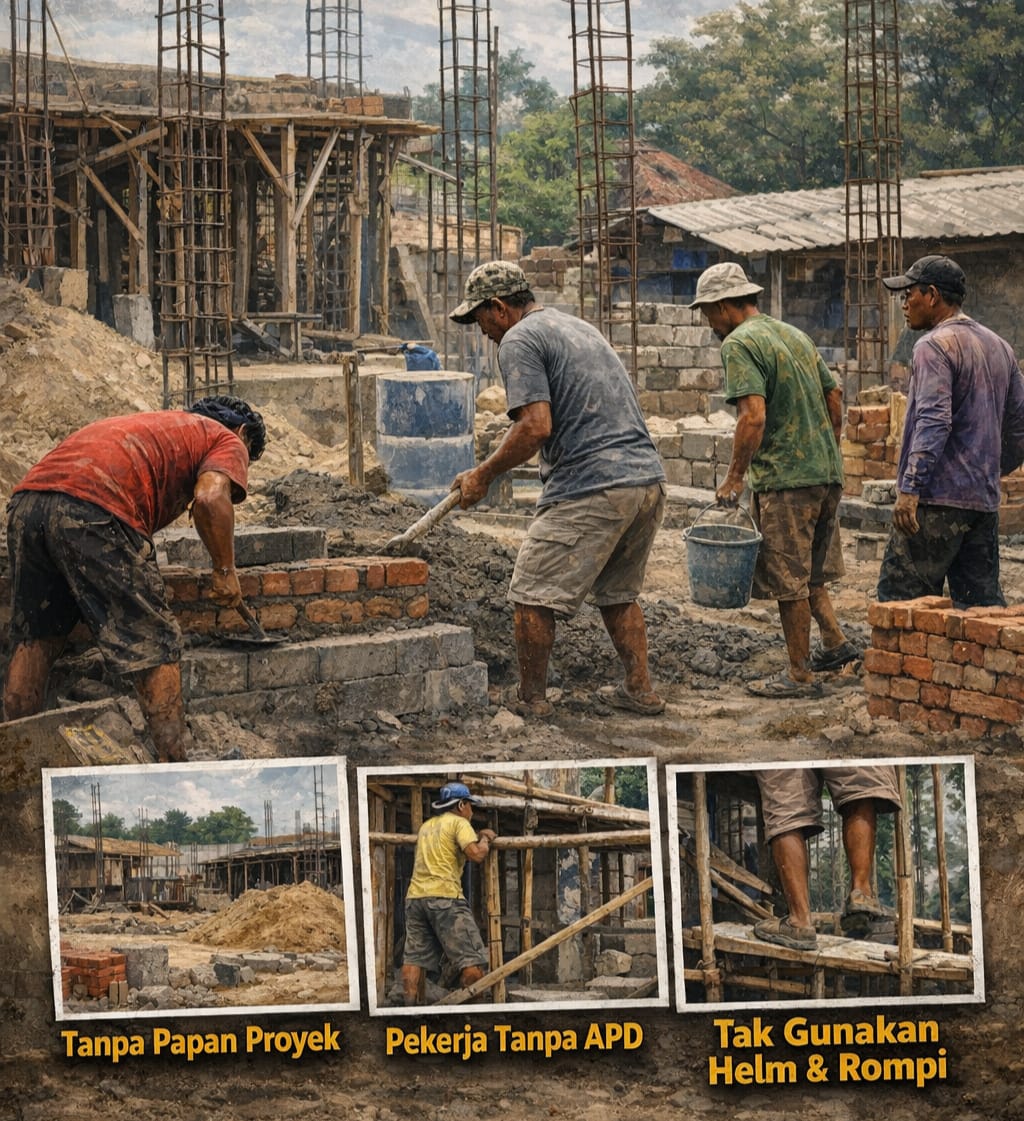 Tak hanya soal transparansi anggaran, temuan lain juga menunjukkan minimnya penerapan standar Keselamatan dan Kesehatan Kerja (K3). Sejumlah pekerja terlihat tidak menggunakan alat pelindung diri (APD) seperti helm proyek dan rompi keselamatan saat melakukan aktivitas konstruksi.