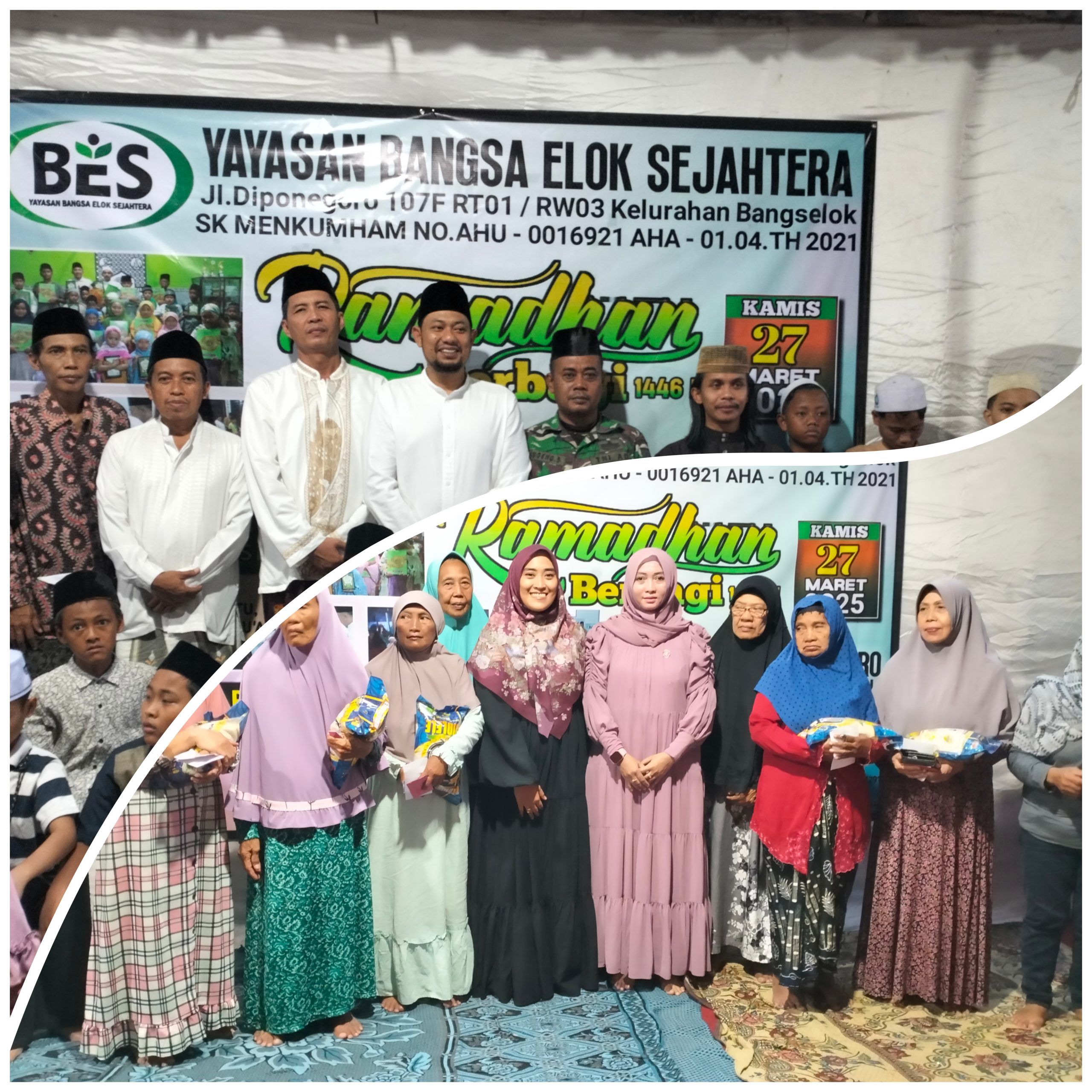 Pada moment yang suci ini, yayasan Bangsa Elok Sejahtera (BES) Kelurahan Bangselok melaksanakan kegiatan sosial dengan memberikan dan menyalurkan santunan kepada 46 anak yatim piatu dan 169 orang kaum dhuafa yang berada dilingkungan Kelurahan Bangselok dan sekitarnya.